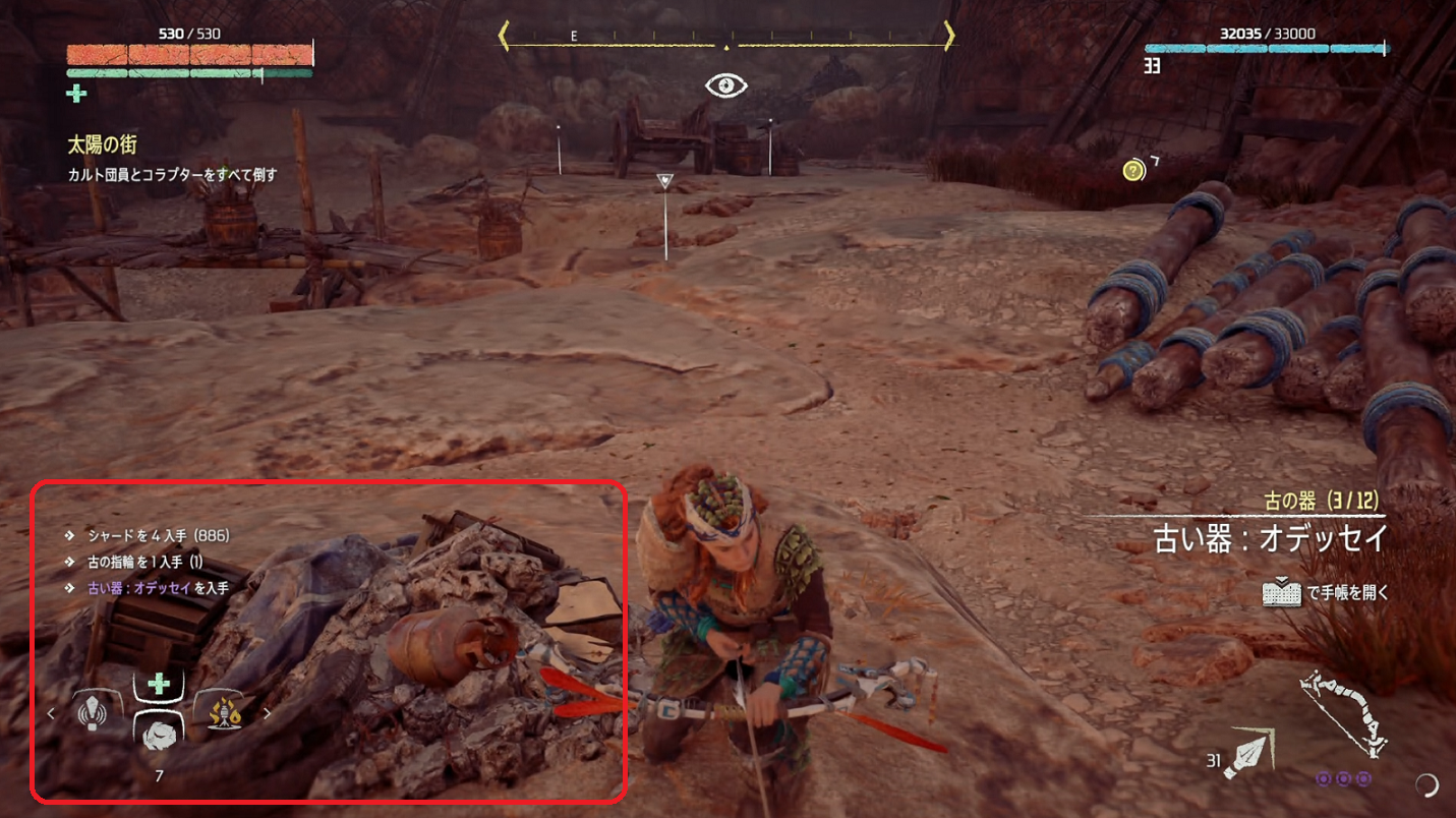 場所はメインクエスト『太陽の街』でコラプター2体と多数のカルト団員と戦闘する発掘現場。