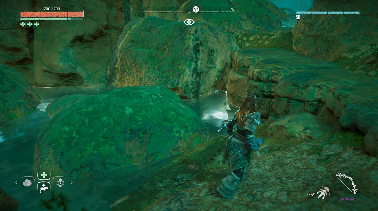 水中にあり岩に囲まれて見つけにくい。