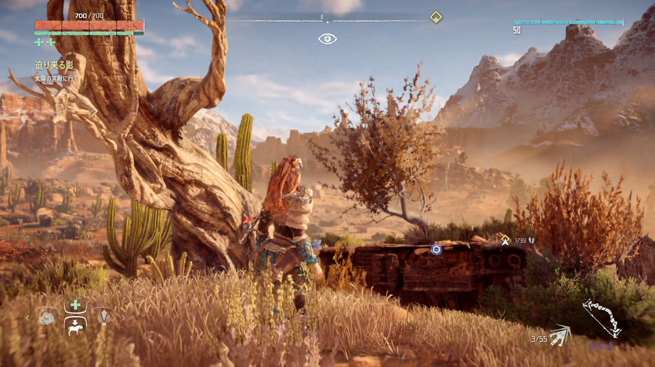 枯れ木の辺りに錆びた戦車があり、その上に置いてある。